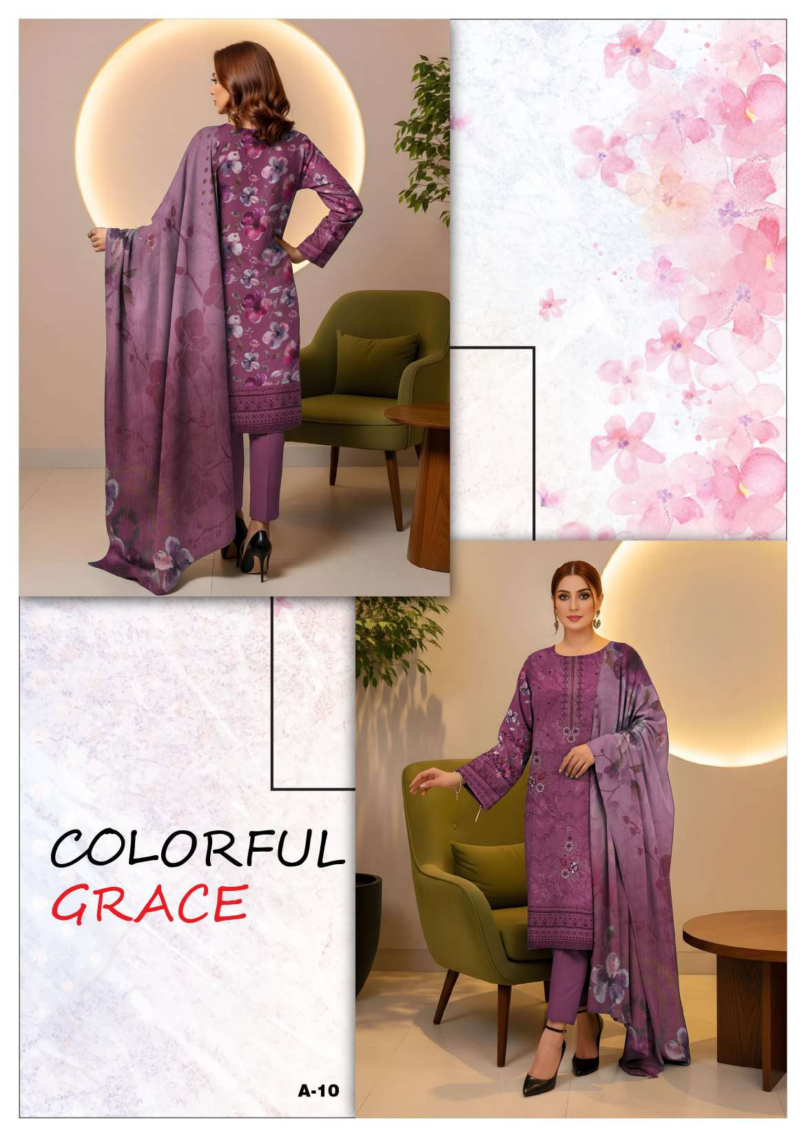 This 3-piece outfit features a beautifully printed viscose embroidered shirt paired with a printed chiffon dupatta and a dyed viscose trouser. The intricate embroidery and soft color palette add a touch of sophistication and grace, perfect for both casual and semi-formal occasions.