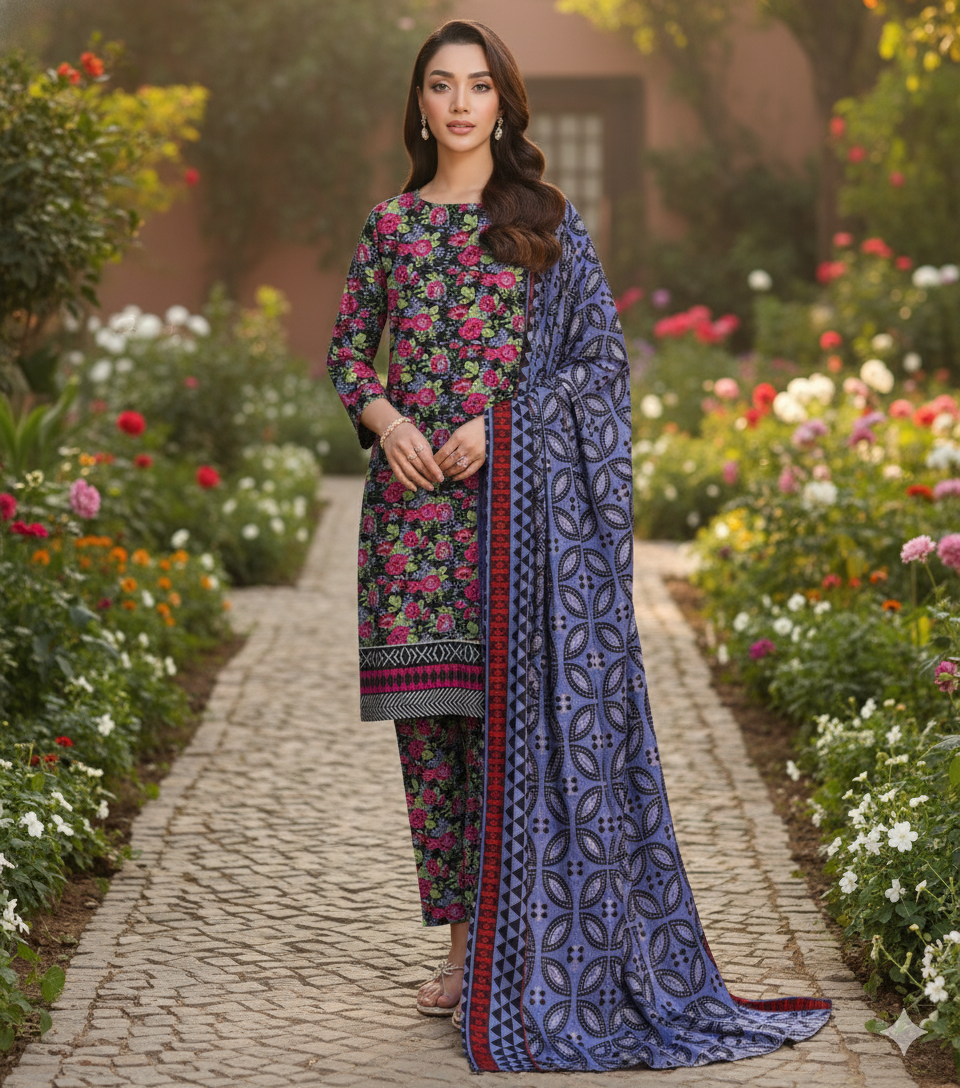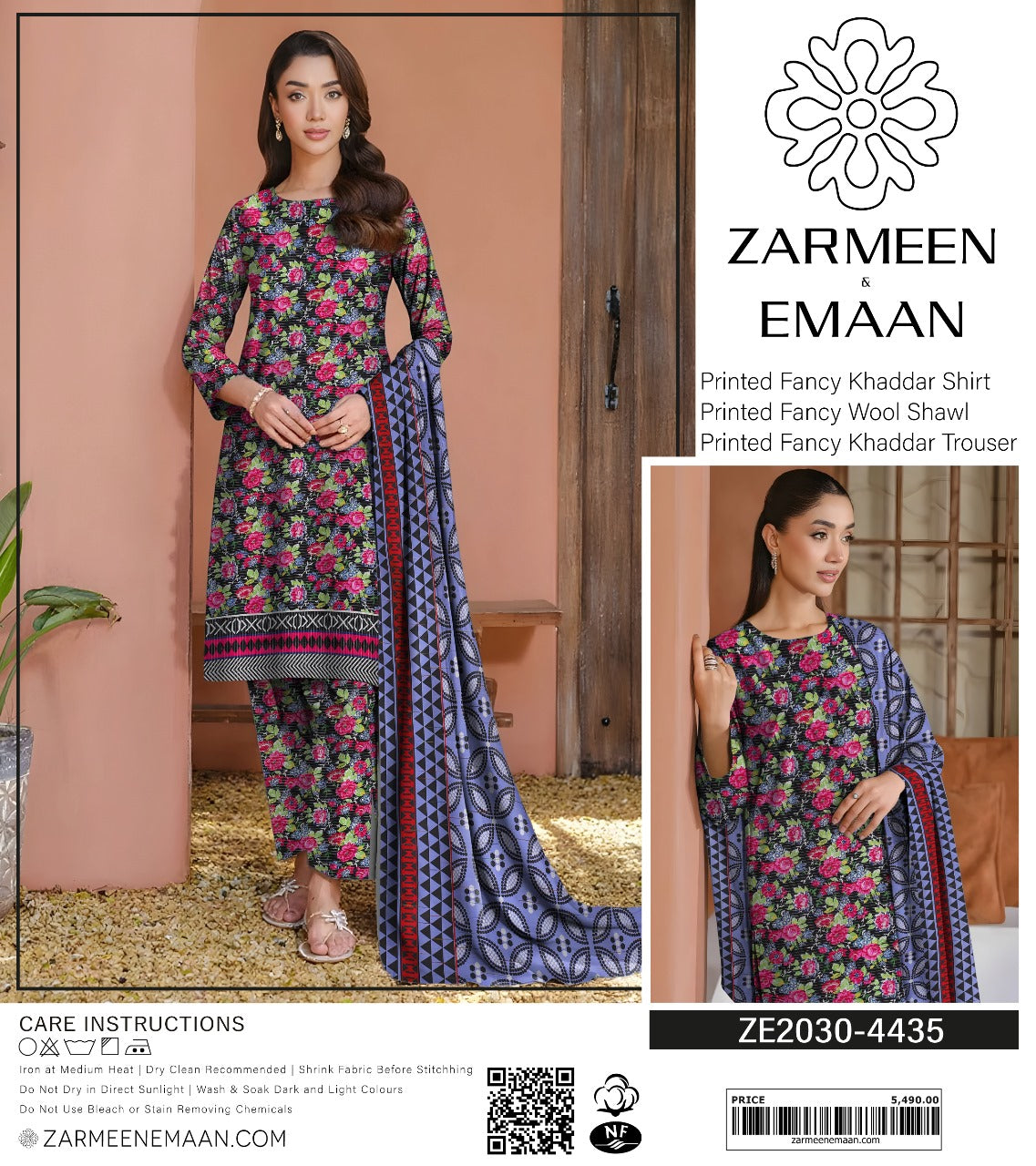A beautiful turquoise 3-piece khaddar suit by Zarmeen & Emaan, featuring a floral printed shirt, wool shawl, and matching trouser. Perfect for winter days, combining comfort with elegant style. Ideal for casual and semi-formal wear.
